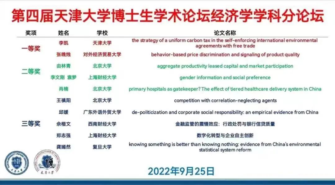在9月25日举办的第四届天津大学博士生学术论坛经济学分论坛上,由上海财经大学经济学院黄振兴常任教授、高等研究院陈媛媛教授指导的2018级李文刚、袁梦和经济学院姚澜常任教授指导的2020级郑志强3位在读博士生提交的经济学论文获评博士生学术论坛优秀论文二等奖和三等奖。