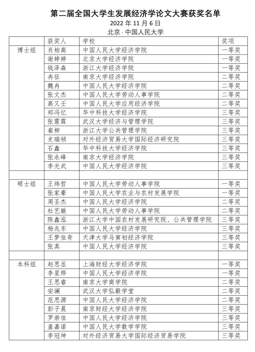 2022年11月5日-6日,由中国人民大学经济学院和中国经济改革与发展研究院共同主办的第四届中国发展理论国际年会暨第二届全国大学生发展经济学论文大赛成功召开。参赛作品覆盖了发展经济学各领域研究方向,紧密结合中国经济发展实践,并运用现代经济学研究方法“讲好中国故事,传播好中国声音、增强在国际上的话语权”。经过初评、匿名评审和终评答辩等环节,大赛选出获奖论文总共31篇,其中博士组14篇、硕士组8篇、本科组9篇。