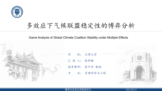 在博士生论坛,天津大学马寅初经济学院创院院长张中祥教授指导的博士生张钟毓在题为“多效应下全球气候联盟稳定性的博弈分析”的报告中,聚焦国际社会亟需解决的气候变化国际合作问题——如何建立一个广泛参与、稳定的、减排效果显著的全球气候联盟。她将气候联盟模型分解为外部效应、时间效应和成本效应,分别在对称和非对称条件下,对比研究了不合作博弈、完全合作博弈、库诺特联盟两阶段静态博弈和斯坦克尔伯格联盟三阶段动态博弈的减排结果,并通过模拟确定了稳定的联盟规模。结论表明,在非对称的斯坦克尔伯格博弈中,三种效应同时发挥作用,各国成本和收益呈现高度偏态分布且为负协方差时,再配合以转让机制,有利于形成广泛参与、高效减排的、稳定的气候联盟。