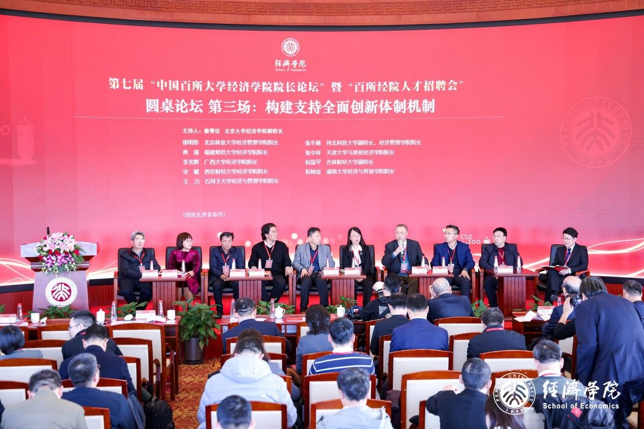 2024年12月14-15日,第七届“中国百所大学经济学院院长论坛”暨“百所经院人才招聘会”在北京大学经济学院成功举办。本次论坛着眼“以进一步全面深化改革推动经济高质量发展”,深入探索推动中国经济高质量发展的体制机制改革,加快建构中国自主的经济学知识体系,为全面推进强国建设、民族复兴伟业提供学术支持。论坛由开幕式、第二届“孙尚清发展知识研究与交流奖”颁奖仪式、“构建高水平社会主义市场经济体制”“健全推动经济高质量发展体制机制”“构建支持全面创新体制机制”和“完善高水平对外开放体制机制”四个圆桌论坛、九场平行分论坛、中国百所经院人才招聘会和“中国经济学博士生论坛”等环节组成。
