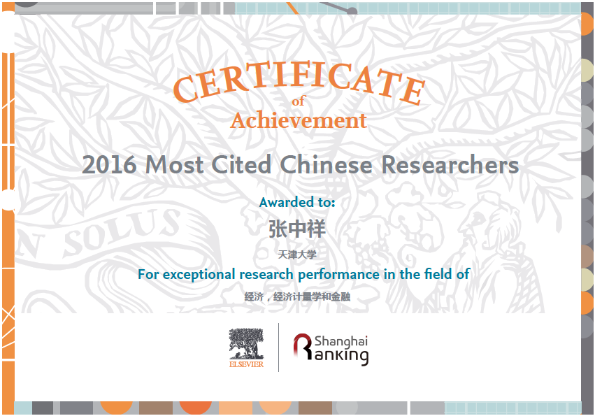 世界著名出版公司爱思唯尔 (Elsevier) 2017年2月27日发布2016年中国高被引学者(Most Cited Chinese Researchers)榜单。在经济、经济计量学和金融领域来自全国10家机构的16名学者上榜,与2015年经济、经济计量学与金融领域中国高被引学者榜单一样,天津大学经管学部张中祥教授再次位列榜单第4位。