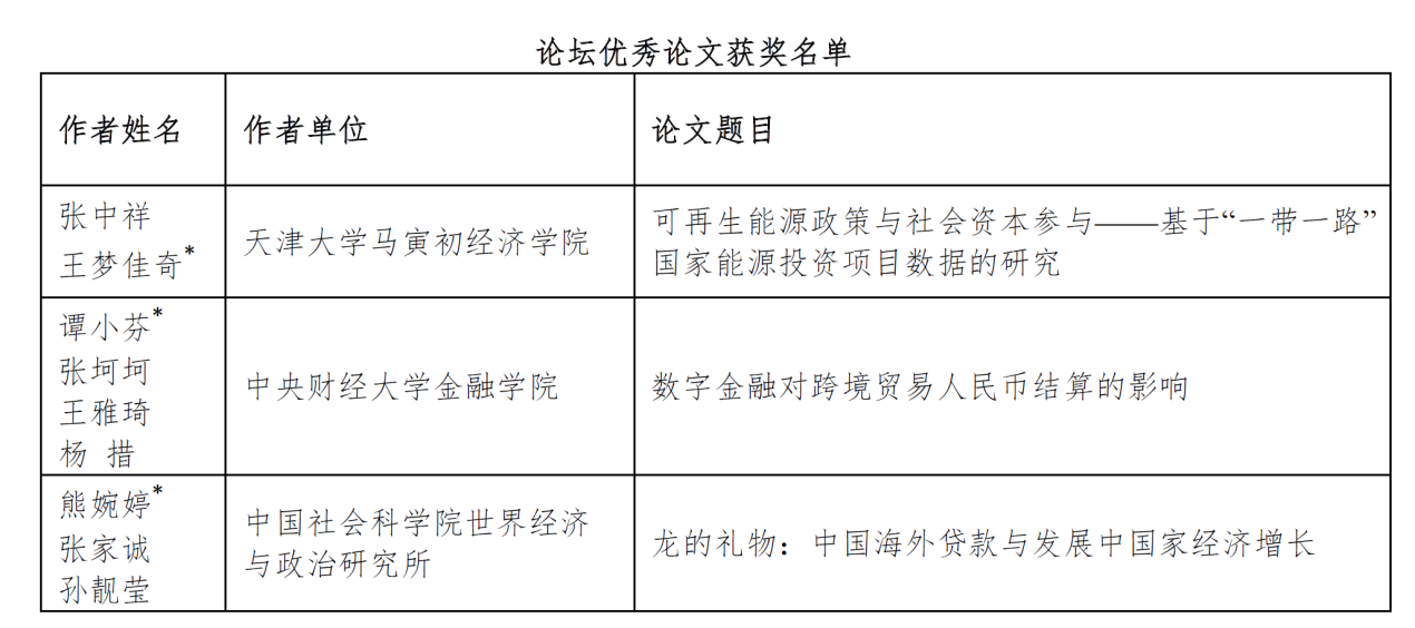 本届论坛自开放投稿以来,受到了海内外学者的积极响应,收到了百余篇来自海内外的高质量投稿。经过初选,论坛共选出18篇论文在“创新发展”、“协同发展”、“绿色发展”以及“数字经济与高质量发展”四个分论坛宣讲,最终来自天津大学马寅初经济学院、中央财经大学金融学院和中国社会科学院世界经济与政治研究所的3篇论文被评为优秀论文。