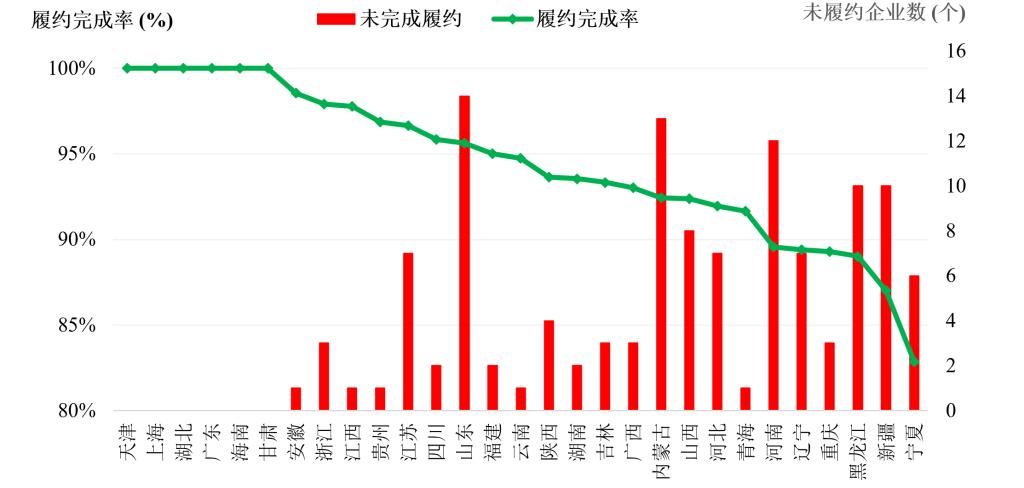 鉴于排放交易被认为是帮助控排企业以最低成本履行减排义务的一种手段,履约完成率是评估排放交易制度绩效的关键指标,而政府尚未公布根据控排企业数量衡量的履约完成率这一重要数据。本文围绕此问题开展了大量的工作,最终整理出全国分省控排企业履约数据,发现全国有121家控排企业没有完成履约,按企业数量计,全国履约完成率为94.4%,比国家公布的按履约量计的履约完成率低5.1%。而且,各省市履约存在明显差别,六省市100%完成履约,但最低的省只有82.9%,全国有14个省市履约率低于全国94.4%的平均水平。