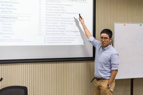 Wataru Nozawa助理教授在会上做了题为“董事会构成,公司环保策略和财务绩效”的报告。报告内容主要围绕两个基本问题展开:一是“什么样的公司在环保策略方面更为严格?”;二是“公司的环保策略会损害财务绩效吗?”。为了回答上述问题,Nozawa利用彭博社收集的全球5712家公司数据展开实证分析。首先,他根据董事会构成状况,对公司进行了基本分类;其次,利用收集到的财务数据测算了各公司的财务绩效水平;最后,依据公司环保策略的披露与执行情况,对环保策略也进行了分类。在此基础上,利用潜在类别分析法,考察各类别变量之间的相互关系。该研究为公司完善董事会结构,选择适当的环保策略,进而增强财务绩效提供了一定的启示。