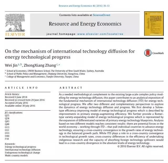 澳大利亚新南威尔士大学商学院大学校长博士后研究员(Vice-Chancellor’s Postdoctoral Research Fellow)靳玮和天津大学管理与经济学部经济学特聘教授张中祥合作的“论技术国际扩散对能源技术进步的影响机制” (On the mechanism of international technology diffusion for energy technological progress, Resource and Energy Economics, Vol. 46, pp. 39 - 61.),与其他6篇文章一起收录于2016年11月出版的Resource and Energy Economics 第46卷。