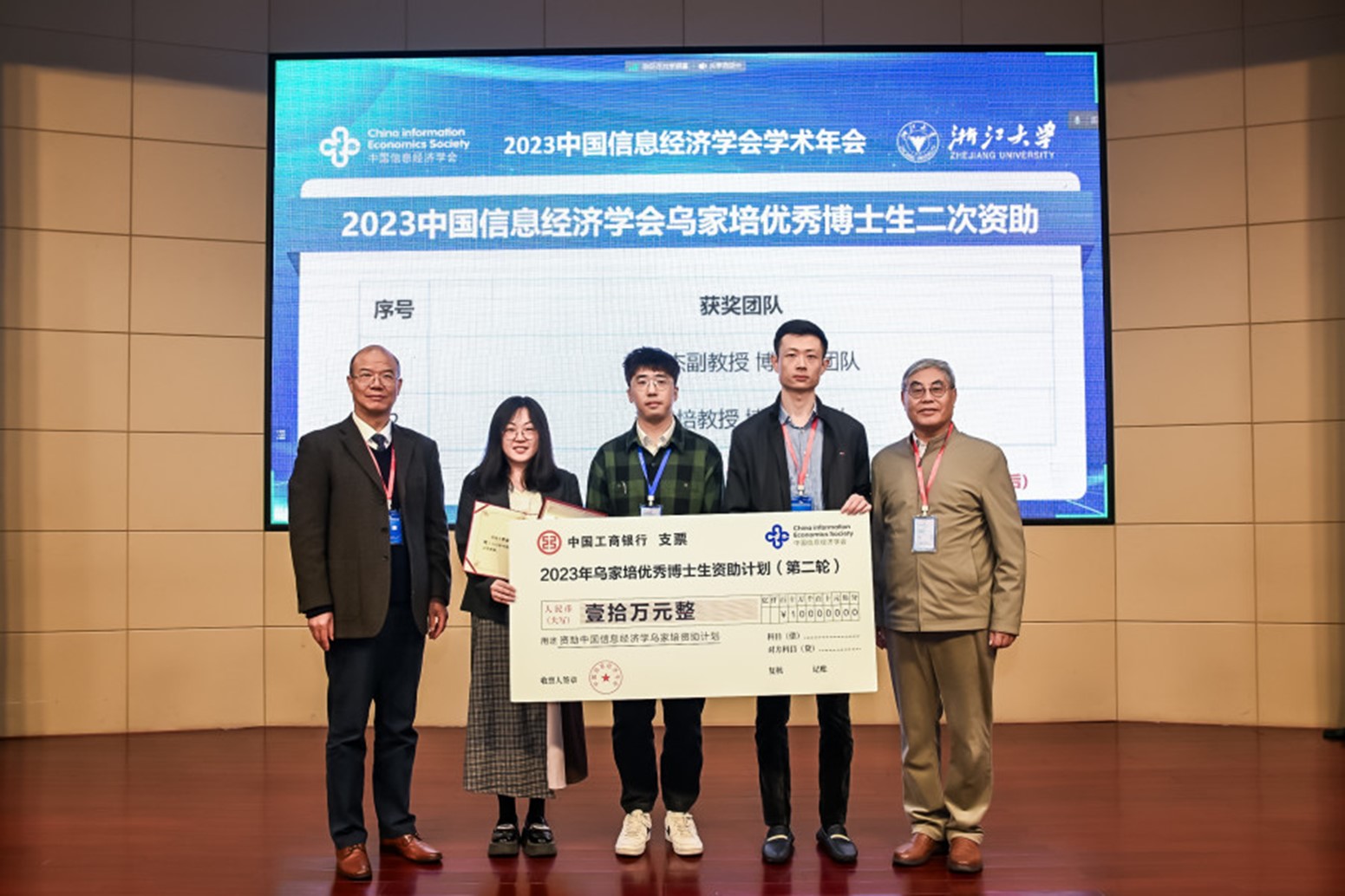 11月26日上午,年会进行了中国信息经济学会乌家培资助计划与创新成果的颁发仪式和报告。学会理事长谢康教授围绕着“四位一体,面向未来”的主题发表致辞。清华大学经管学院林志杰副教授的博士生张啸威和对外经济贸易大学国际经贸学院李建培教授的博士生张晚烛代表优秀博士生团队接受乌家培优秀博士生二次资助颁奖。