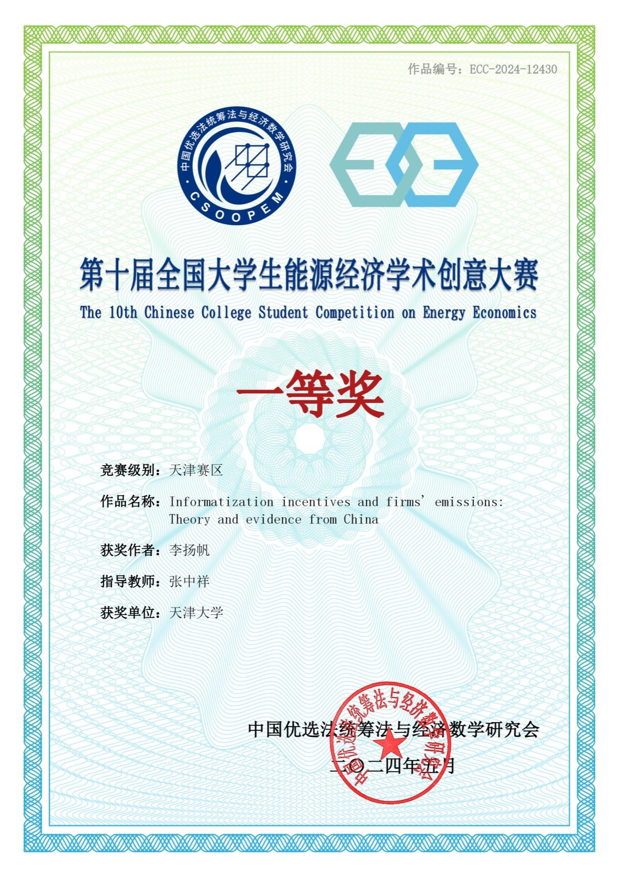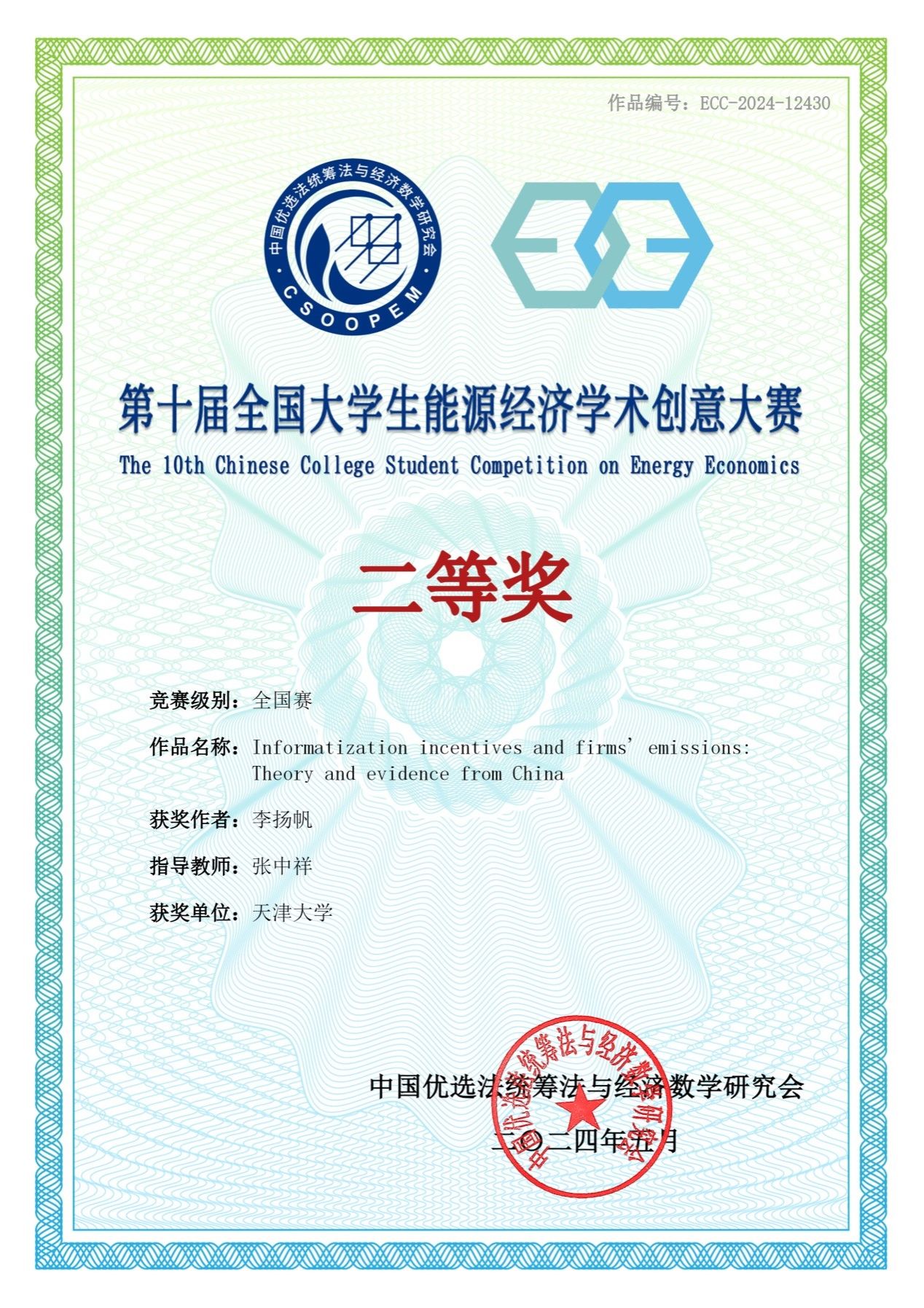 近日,由中国优选法统筹法与经济数学研究会主办,中国“双法”学会低碳发展管理专业委员会和中国地质大学承办的第十届全国大学生能源经济学术创意大赛成功举办。经过校赛、区域赛和国赛三级赛事,天津大学马寅初经济学院创院院长张中祥教授指导的2022级博士生李扬帆的论文“Informatization incentives and firms’ pollution emissions: Theory and evidence from China”荣获第十届全国大学生能源经济学术创意大赛(研究生组)二等奖。之前,该文曾获得第十届全国大学生能源经济学术创意大赛(研究生组)天津赛区一等奖。