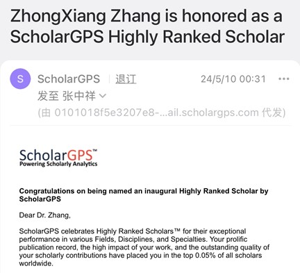 2024年5月10日,ScholarGPS发布首版ScholarGPS Highly Ranked Scholar榜单。该榜单收录依据发表、影响和质量综合评估,全球进入前0.05%(万分之五)的顶尖学者。张中祥入选首版ScholarGPS全球前0.05%顶尖学者榜单。