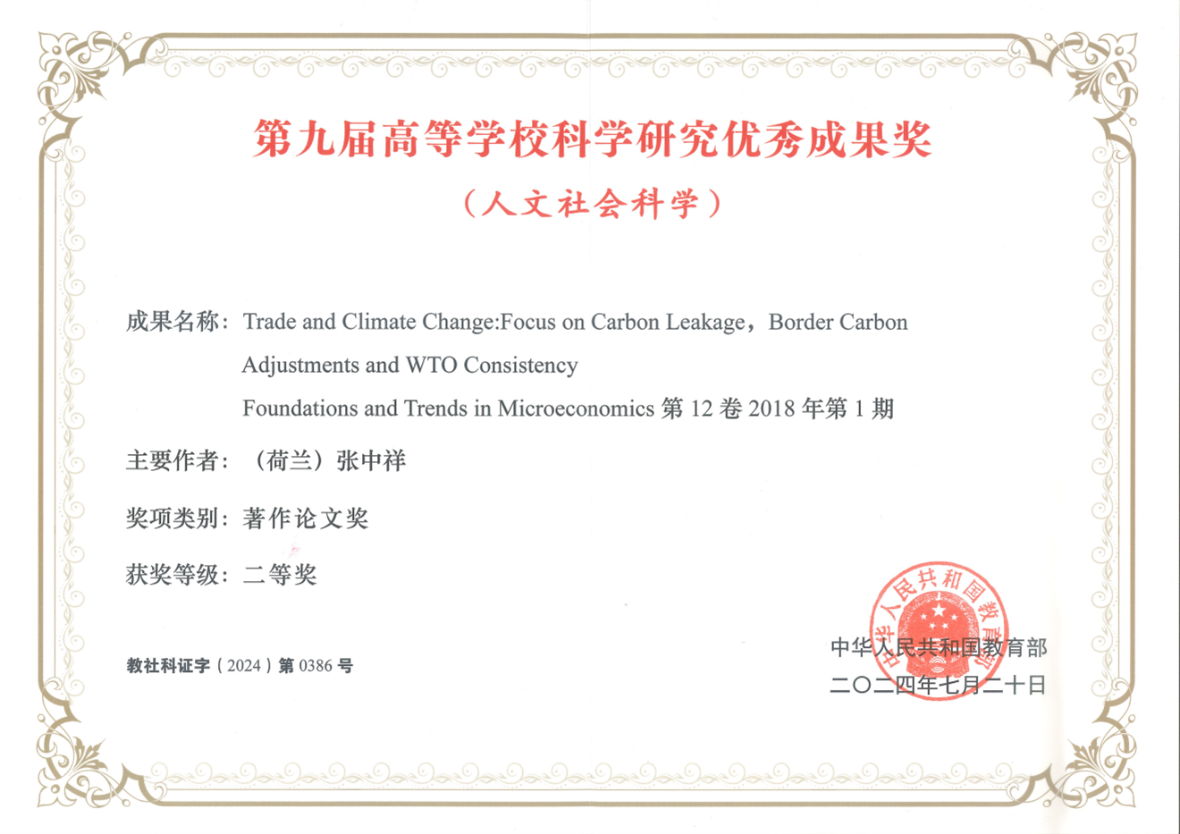 张中祥独著论文“Trade and Climate Change: Focus on Carbon Leakage, Border Carbon Adjustments and WTO Consistency”《国际贸易与气候变化:聚焦碳泄漏、碳排放边境调节和WTO一致性》,荣获第九届高等学校科学研究优秀成果(人文社会科学)二等奖(经济学)。