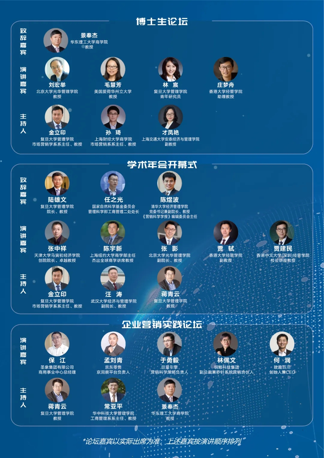 学术年会开幕式 致辞: 复旦大学管理学院院长 陆雄文教授 国家自然科学基金委员会管理科学部工商管理二处 任之光处长 清华大学经济管理学院党委书记兼副院长、《营销科学学报》编辑委员会主任 陈煜波教授  |