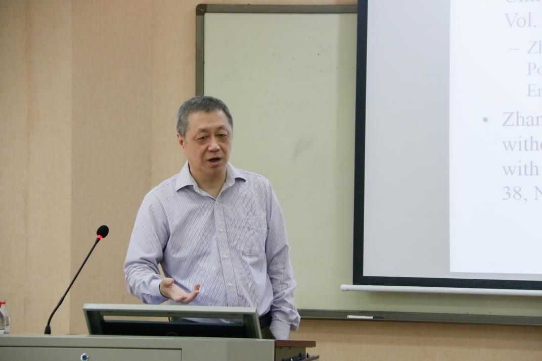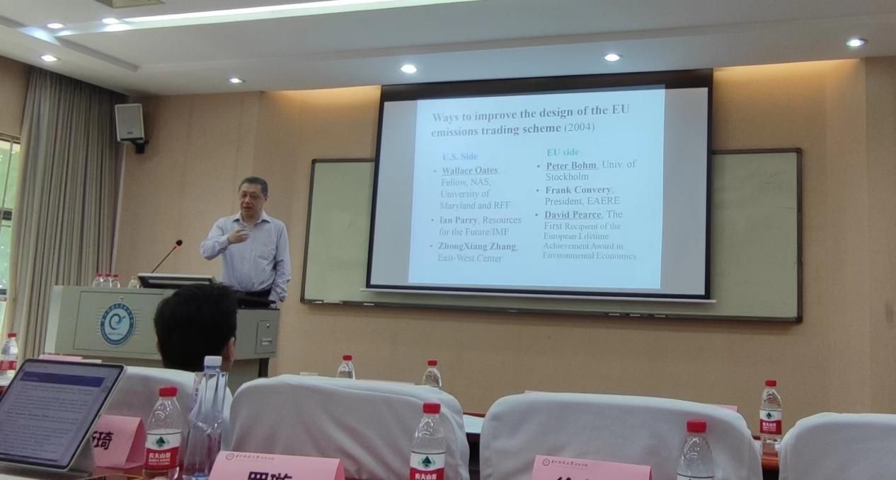 张中祥以《国际贸易与气候变化》为题进行主题报告。他围绕碳排放泄露和碳排放调节展开分享,分析估算对应影响及各类政策举措的有效性。