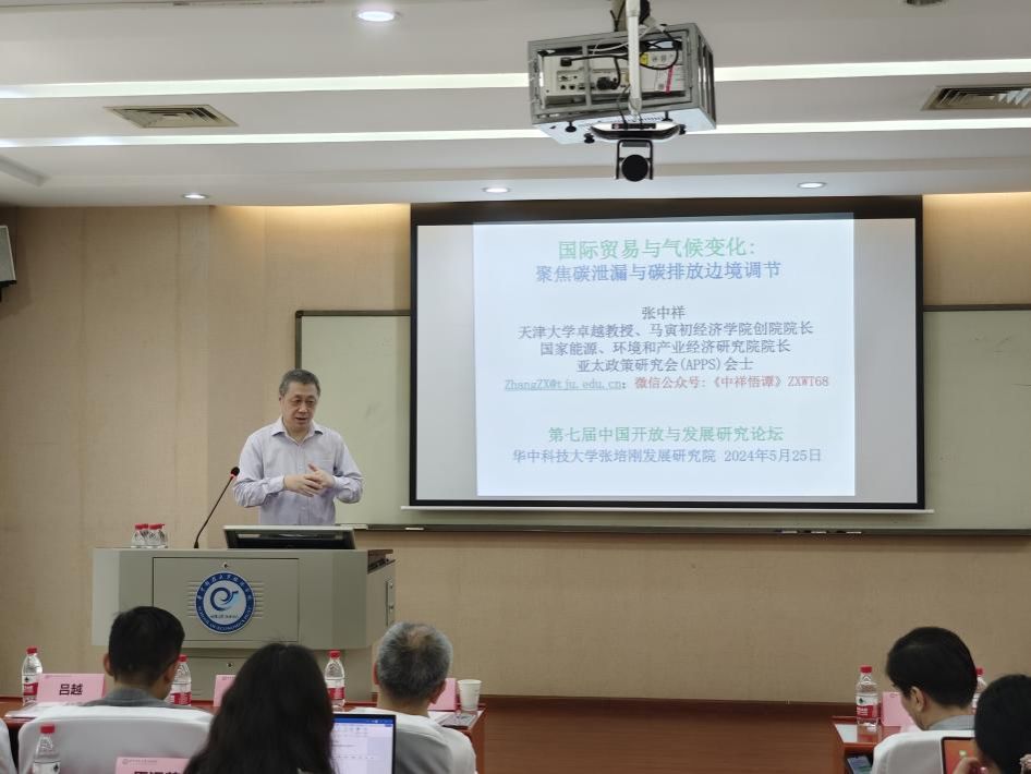 第七届中国开放与发展研究论坛高级培训第一场于5月25日上午在经济学院106会议室顺利举行。本次论坛由华中科技大学张培刚发展研究院开放与发展研究中心和华中科技大学自贸区研究中心承办,会议邀请天津大学卓越教授、马寅初经济学院创院院长、国家能源、环境和产业经济研究院院长张中祥带来题为《国际贸易与气候变化》的主题演讲,本次会议由华中科技大学经济学院院长张建华作开幕致辞,学院教授陈波主持。