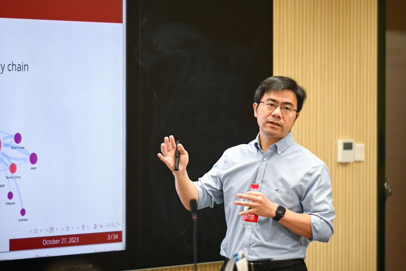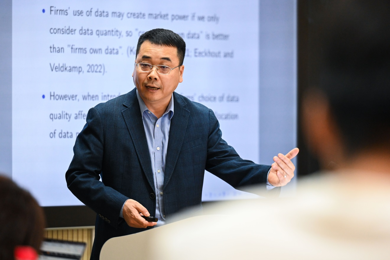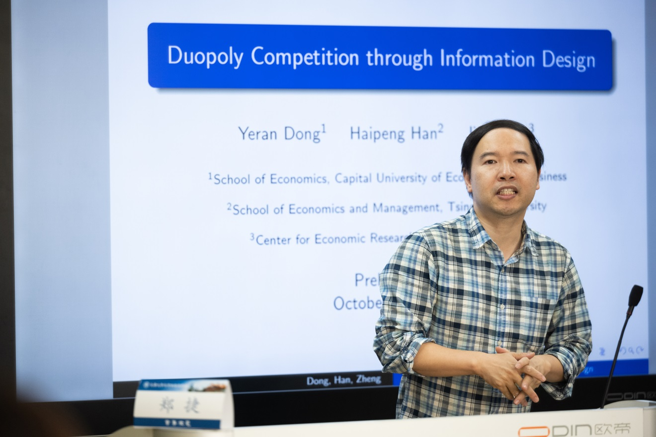 山东大学经济研究院特聘教授郑捷报告了产业链结构中上游差异性定价与下游竞争性信息设计相结合的问题。通过在竞争性信息设计博弈与一般性全支付拍卖模型之间建立起一一对应的关系,他与合作者研究发现,产品质量较低的下游厂商将采用完全披露的广告策略,而产品质量较高的下游厂商则可能采用部分披露的广告策略,其部分披露的程度取决于两家厂商生产技术的相对水平。