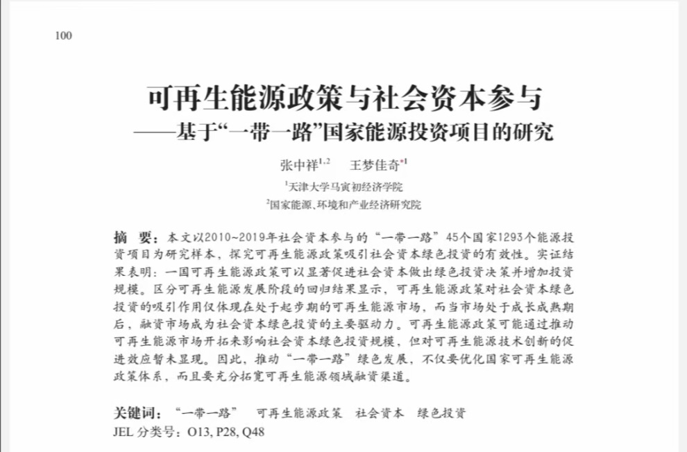 天津大学马寅初经济学院创院院长、卓越教授张中祥和指导的2020级硕士研究生王梦佳奇的合作论文“可再生能源政策与社会资本参与——基于“一带一路”国家能源投资项目数据的研究”在中国社会科学院主管主办的《中国经济学人》(China Economist)正式发表,刊登在2023年4月出版的该刊第18卷、第2期上。这期是中英文双语刊,文章的中、英文版同时刊出。