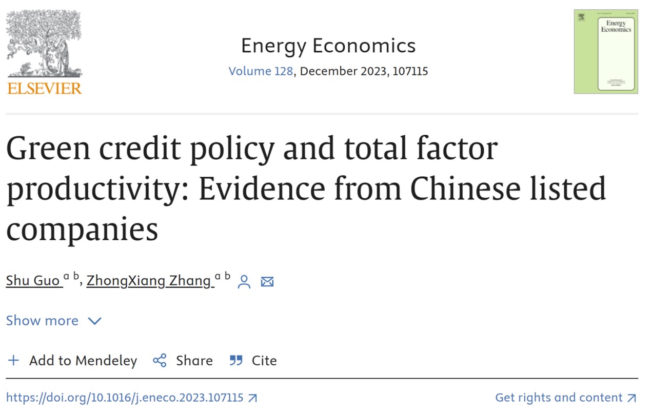 Shu Guo and ZhongXiang Zhang* (2023), Green Credit Policy and Total Factor Productivity: Evidence from Chinese Listed Companies,Energy Economics, Vol. 128, Article 107115.