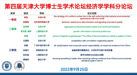 为了表达对博士生同学们踊跃投稿和积极参与的感谢和对同学们研究工作的鼓励,本次论坛继续颁发了优秀论文奖。天津大学李凯和对外经济贸易大学张晚烛荣获优秀论文一等奖,北京大学由林青、上海财经大学李文刚、袁梦和北京大学肖楠获优秀论文二等奖,北京大学王禛阳、广东外语外贸大学邱媛、西南财经大学佘楷文、上海财经大学郑志强和复旦大学龚嫣然获三等奖。