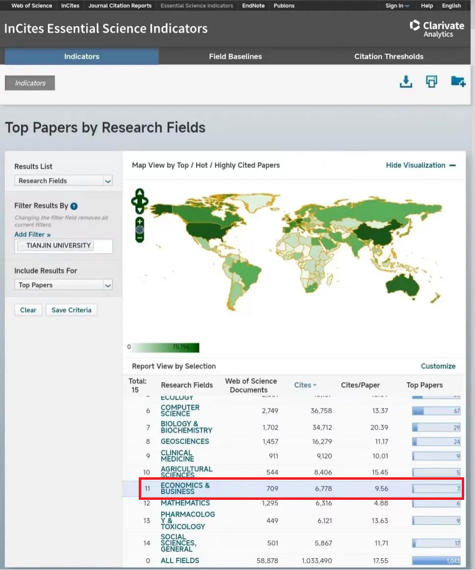 据科睿唯安最新ESI数据,天津大学经济与商学(Economics & Business)学科首次进入ESI学科排名全球前1%。到目前为止,经济与商学学科全球共有452家机构进入ESI全球前1%。